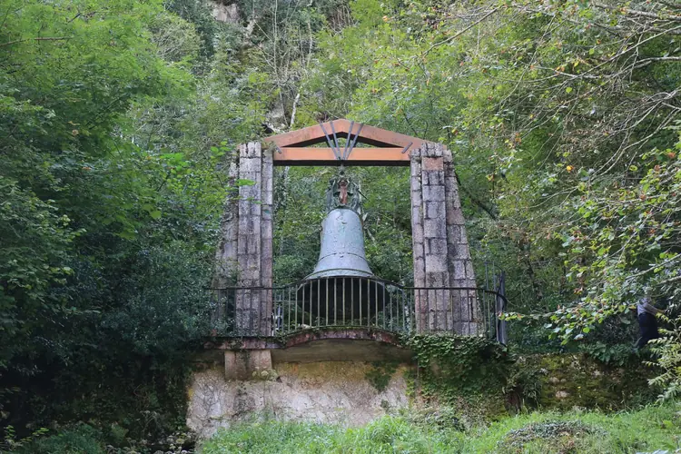 Escultura «Campana Monumental». Poco antes de entrar en el tunel de la Santa Cueva, arriba a nuestra derecha podemos ver esta campana. Cumple una función meramente decorativa y ha sido realizada por los altos hornos asturianos en la Compañ& ...